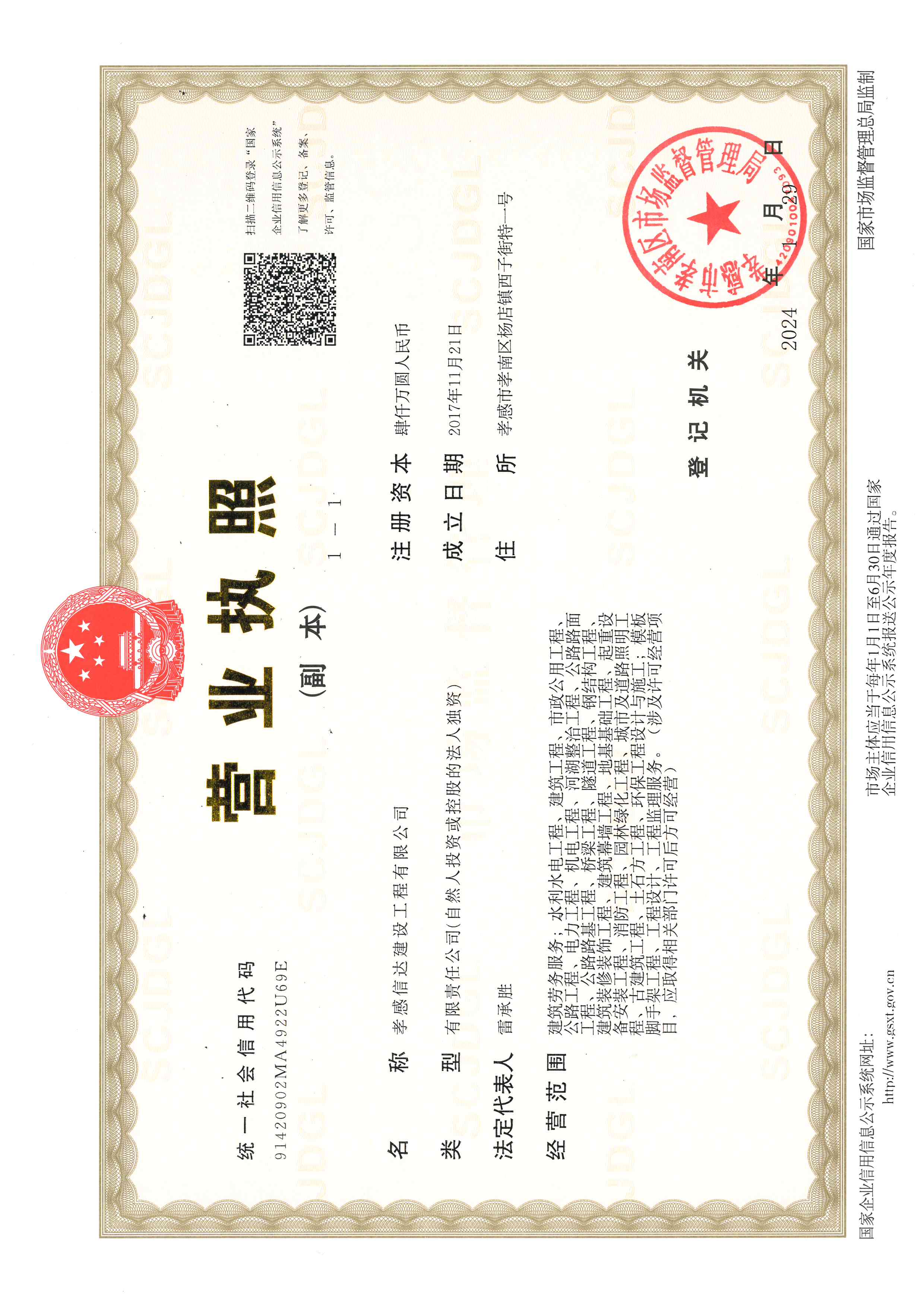 孝感信達建設工程有限公司成立于2017年11月21日,地址:孝感市孝南區(qū)楊店鎮(zhèn)西子街特一號,注冊資金4000萬元,有限責任公司(自然人投資或控股)。