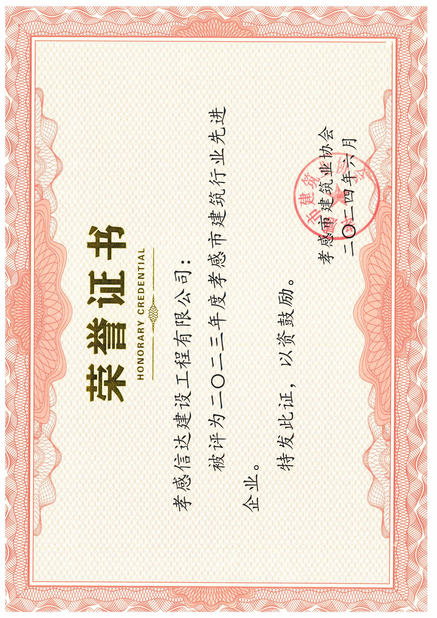 2023年度孝感市建筑行業(yè)先進企業(yè)祝賀孝感信達建設工程有限公司榮獲2023年度孝感市建筑行業(yè)先進企業(yè)榮譽...